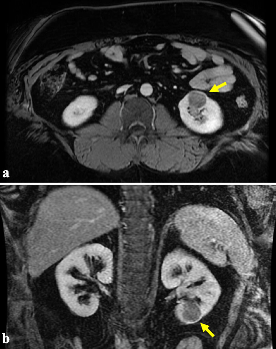 ![]() Click for large image | Figure 2. (a, b) Representative magnetic resonance imaging (MRI) demonstrating an enhancing 2.8 × 2.5 × 2.9 cm left renal mass as indicated by the arrows. |