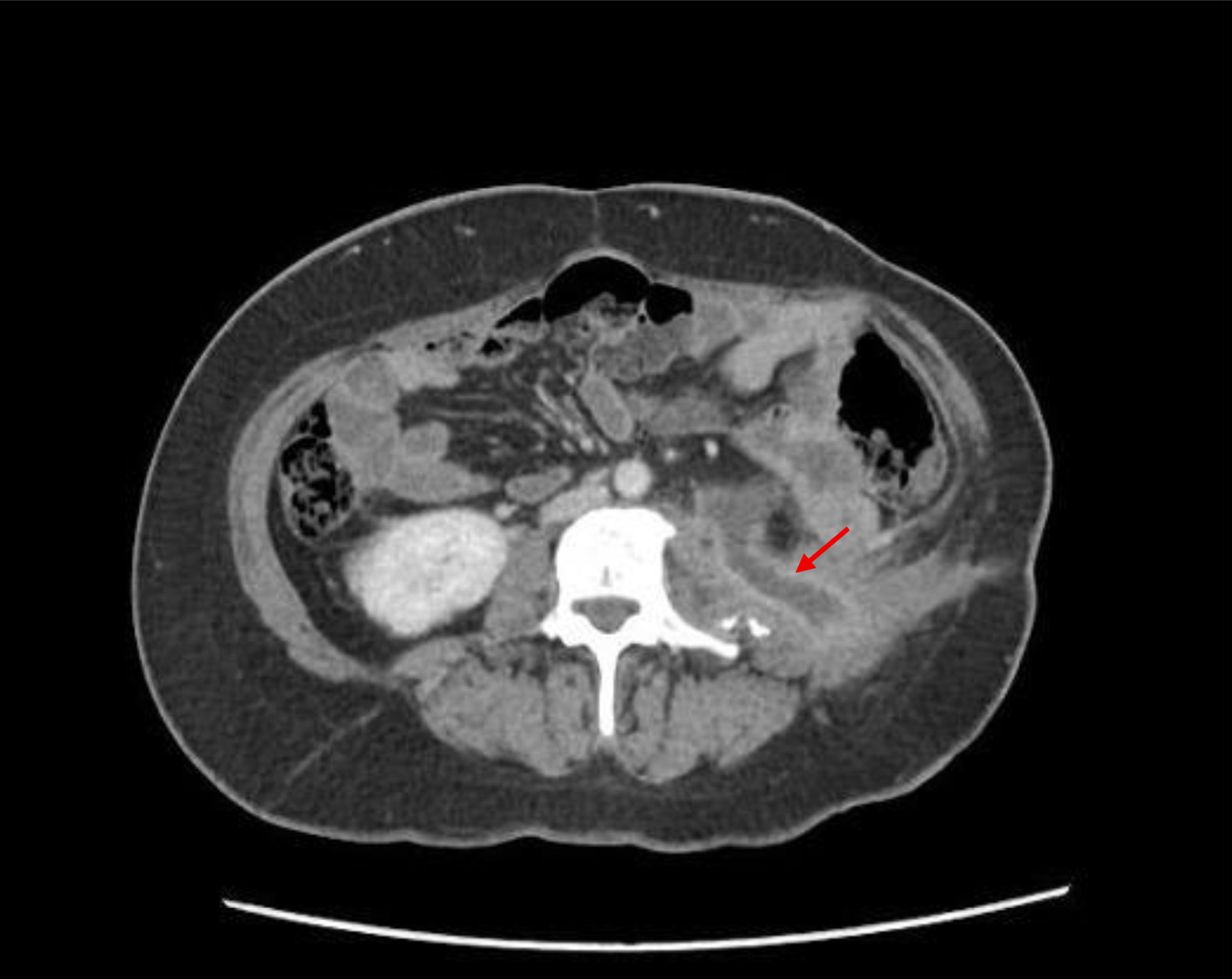 ![]() Click for large image | Figure 2. Transverse plane of contrast-enhanced computed tomography (CT) scan showing a cutaneous tract on the left side measuring approximately 28 mm in length (arrow), along with evidence of prior left nephrectomy. |