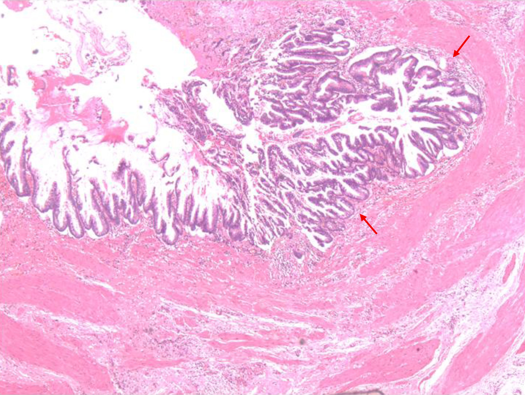 ![]() Click for large image | Figure 4. Histopathological section of the ureteric wall showing a lesion with papillary configuration, composed of fused tubules lined by columnar epithelium and goblet cells exhibiting pseudostratification and low-grade dysplasia (arrows). No evidence of muscularis or vascular invasion is identified. |