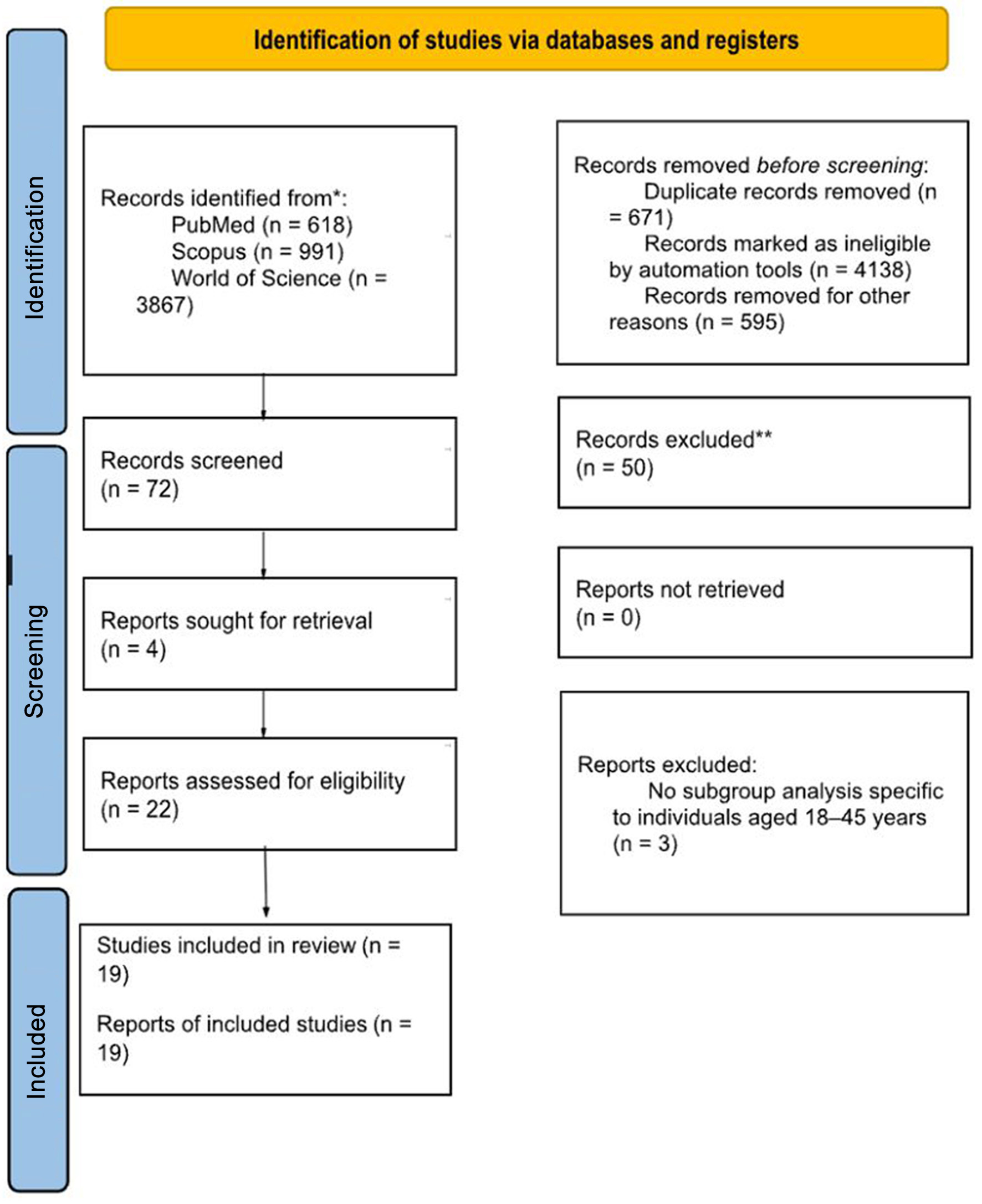 Out of these, four full-text reports were sought for retrieval, and all were successfully retrieved. Following full-text assessment of 22 reports, three were excluded due to lack of subgroup analysis specific to individuals aged 18–45 years.