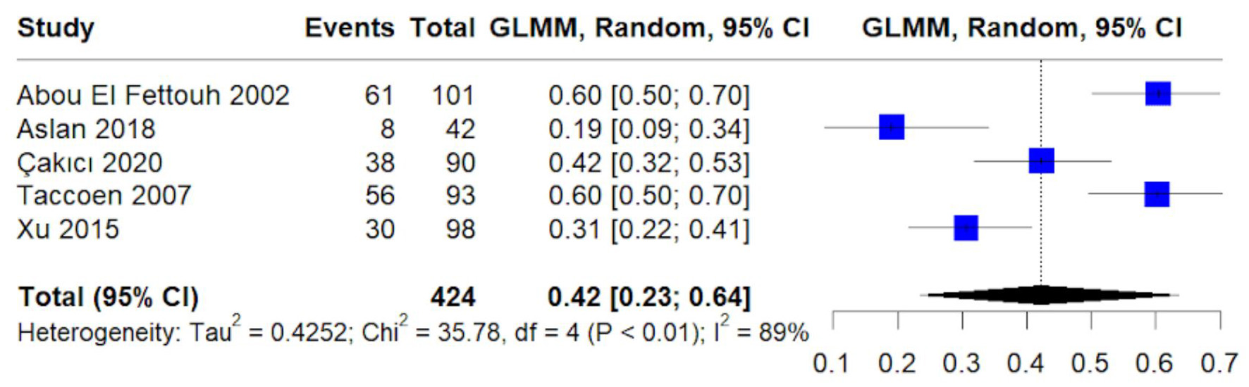 The pooled proportion of symptomatic tumor diagnoses was 42% (95% CI: 23–64%) (Fig. 3). These cases were typically detected due to hematuria, flank pain, or other symptoms, and the heterogeneity (I2 = 89%) likely reflects variation in symptom definitions and diagnostic pathways.