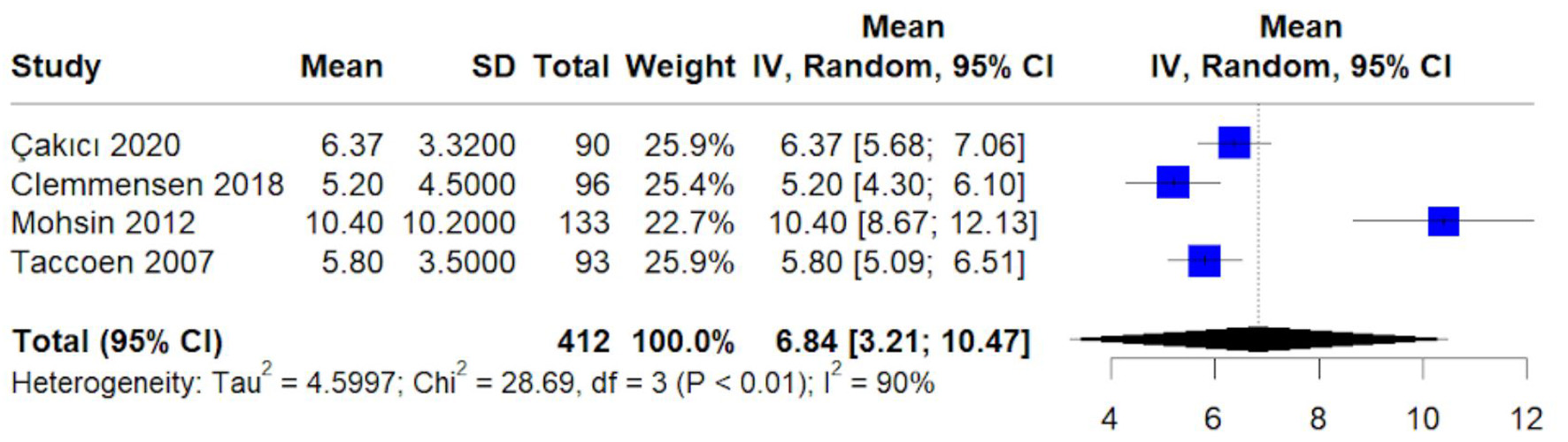 The pooled mean tumor size was 6.84 cm (95% CI: 3.21–10.47 cm) (Fig. 4). Substantial heterogeneity (I2 = 90%) suggests variability in case mix and timing of detection across cohorts.