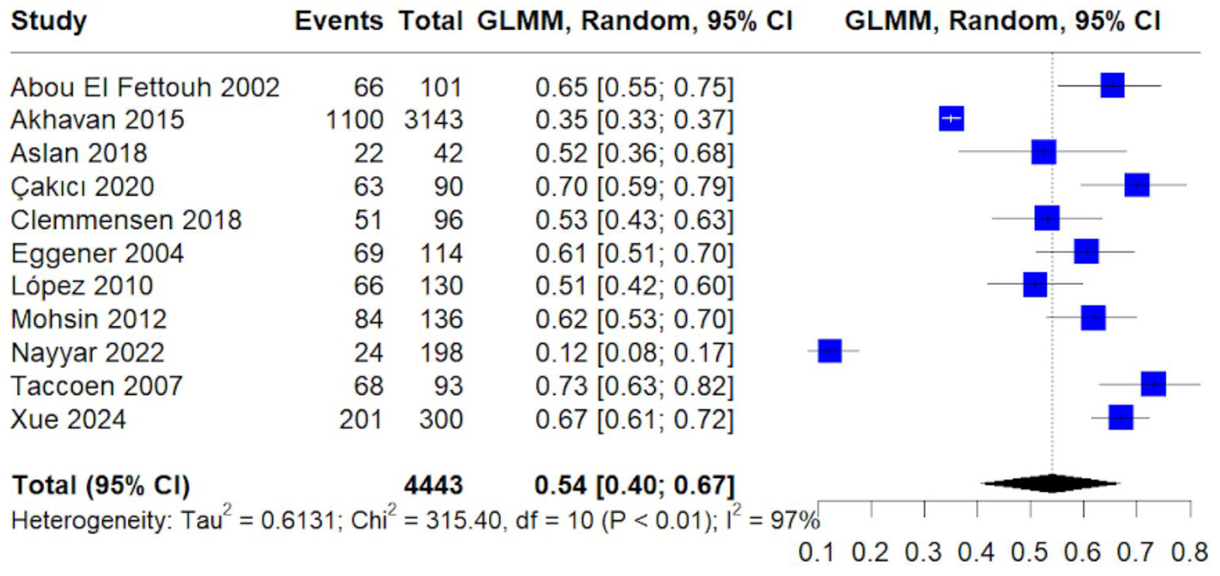 ![]() Click for large image | Figure 7. Forest plot of pooled proportion of chromophobe histology. Random-effects GLMM estimating prevalence of chromophobe renal cell carcinoma. |