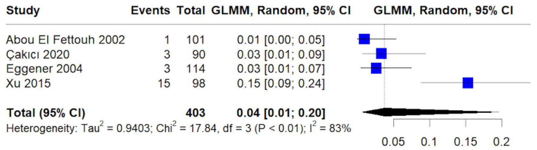 The pooled recurrence rate was 4% (95% CI: 1–20%) (Fig. 8). Heterogeneity was high (I2 = 83%), likely related to differences in follow-up duration and recurrence definitions across cohorts.