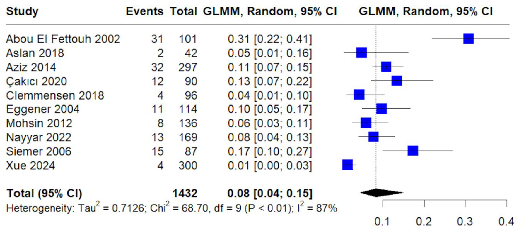 The pooled overall mortality was 8% (95% CI: 4–15%) (Fig. 9). High heterogeneity (I2 = 87%) suggests variability in baseline risk, stage distribution, and duration of follow-up.