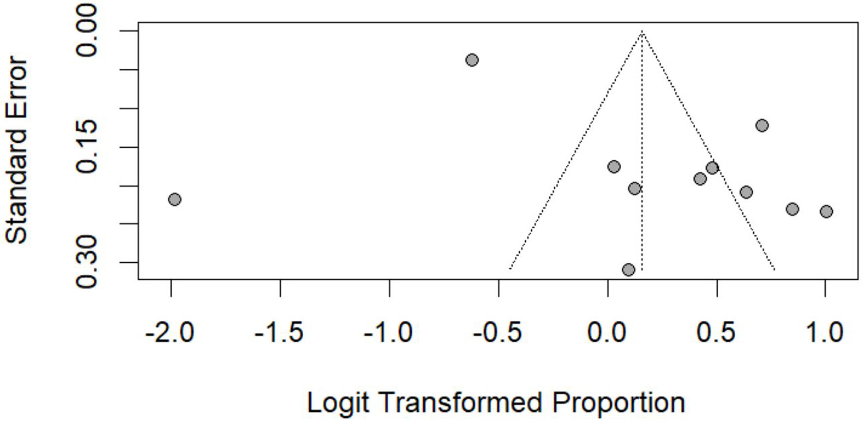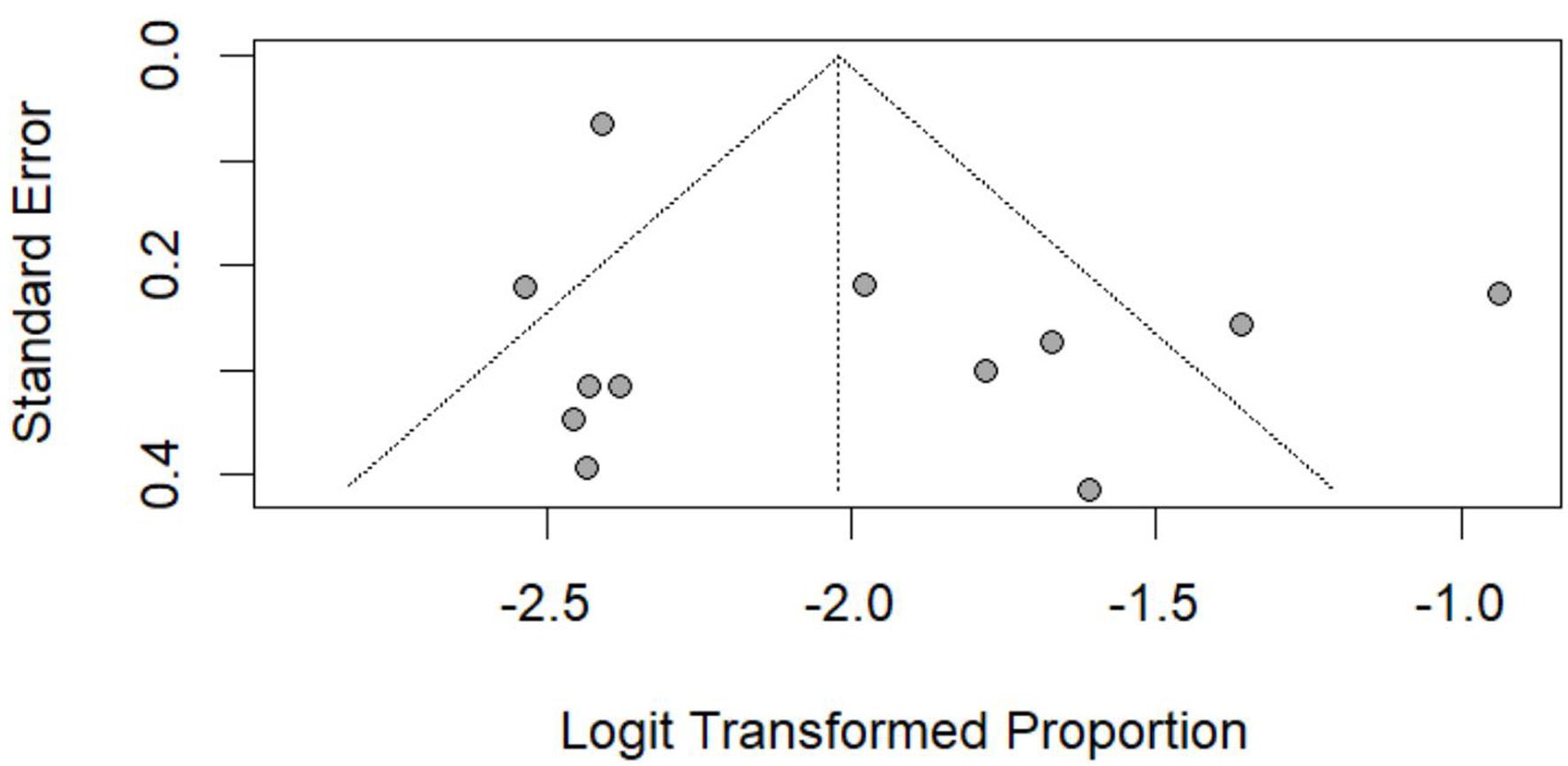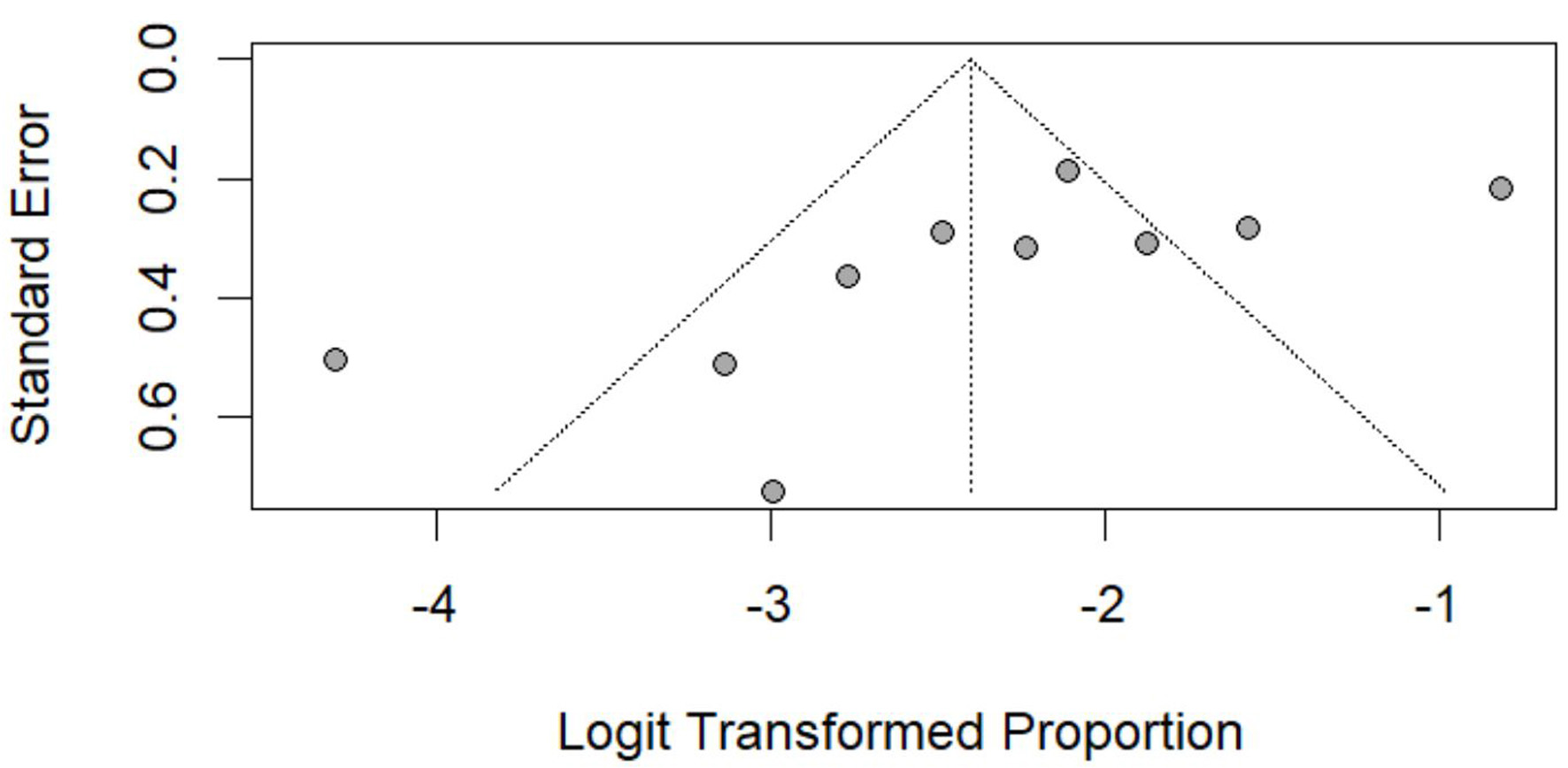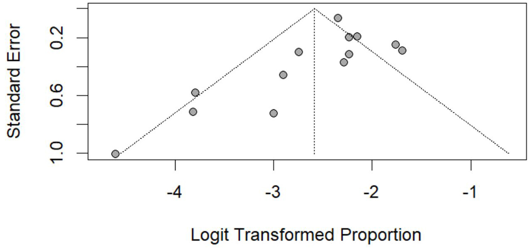 The funnel plots compared the standard error against the logit-transformed proportions. Asymmetry in the funnel plots was visually evaluated to detect potential small-study effects or publication bias.